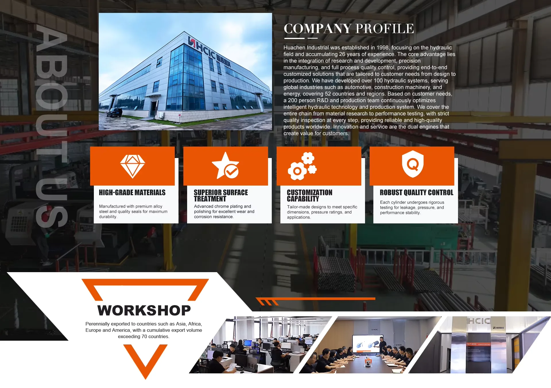 Η HCIC Hydraulic είναι επαγγελματίας κατασκευαστής υδραυλικών, που ειδικεύεται στο σχεδιασμό, την κατασκευή, την εγκατάσταση, τον μετασχηματισμό, τη θέση σε λειτουργία και τις πωλήσεις μάρκας υδραυλικών εξαρτημάτων υδραυλικών συστημάτων. Προσφέρουμε τεχνικές υπηρεσίες και δεσμευόμαστε να παρέχουμε στους πελάτες μας ασφαλή και αξιόπιστα προϊόντα που πληρούν τις πιο απαιτητικές απαιτήσεις. Η ομάδα μηχανικών HCIC συνεργάζεται στενά με τους πελάτες για να κατανοήσει τις εφαρμογές τους. Χρησιμοποιώντας μια σειρά αποδεδειγμένων μεθόδων σχεδιασμού και προηγμένου εξοπλισμού κατασκευής, σε συνδυασμό με την απαράμιλλη εμπειρία μηχανικής και κατασκευής, η HCIC Hydraulics αναπτύσσει ασφαλείς και αξιόπιστους υδραυλικούς κυλίνδρους για κρίσιμες εφαρμογές, που υποστηρίζονται από απαράμιλλη εξυπηρέτηση πελατών. Σχεδιάζουμε, κατασκευάζουμε και παράγουμε υδραυλικούς κυλίνδρους σε ένα υπερσύγχρονο εργοστάσιο παραγωγής και τηρούμε το πιστοποιημένο κατά ISO 9001-2015 σύστημα διαχείρισης ποιότητας για να διασφαλίσουμε τα προϊόντα υψηλότερης ποιότητας στους πελάτες μας.