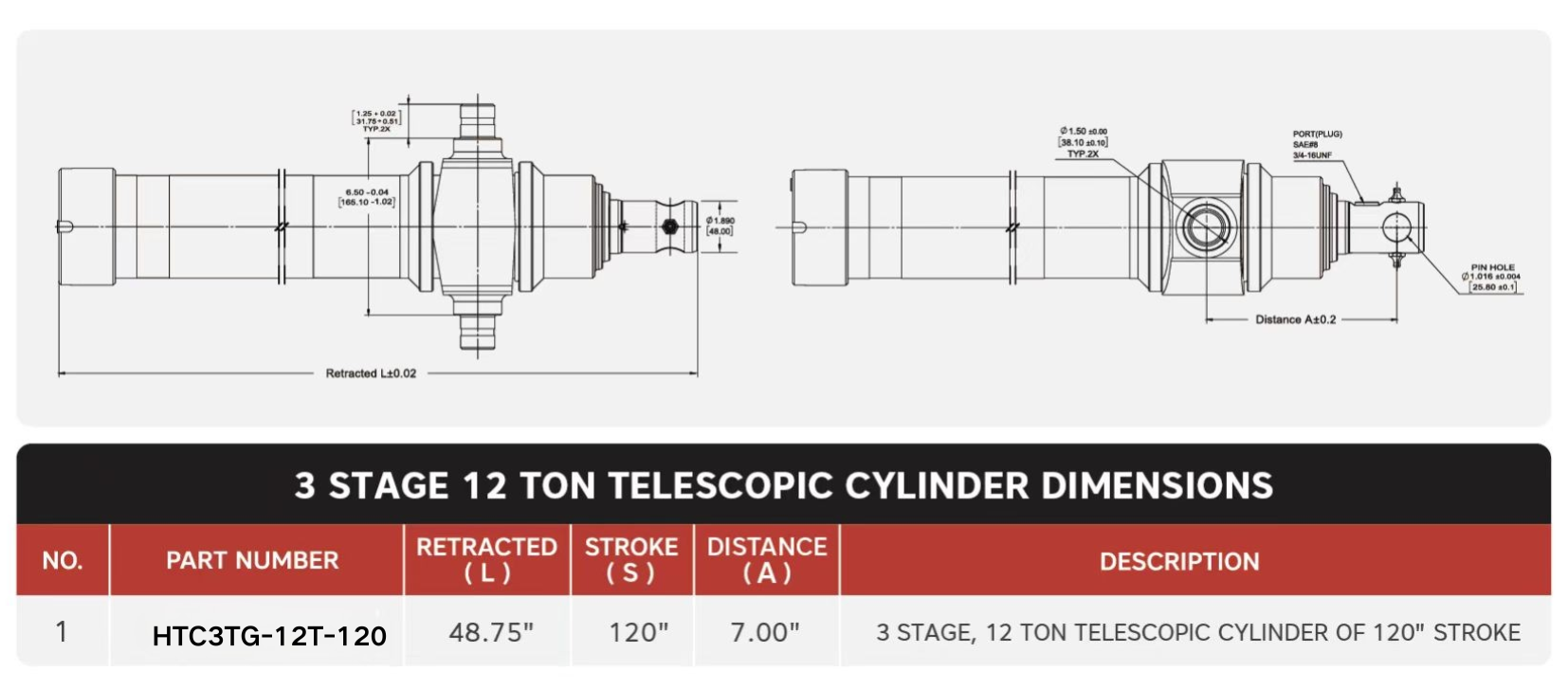 Τηλεσκοπικοί κύλινδροι "HTC3TG-12T-120", 3 Stage, 12 Ton Of 120"